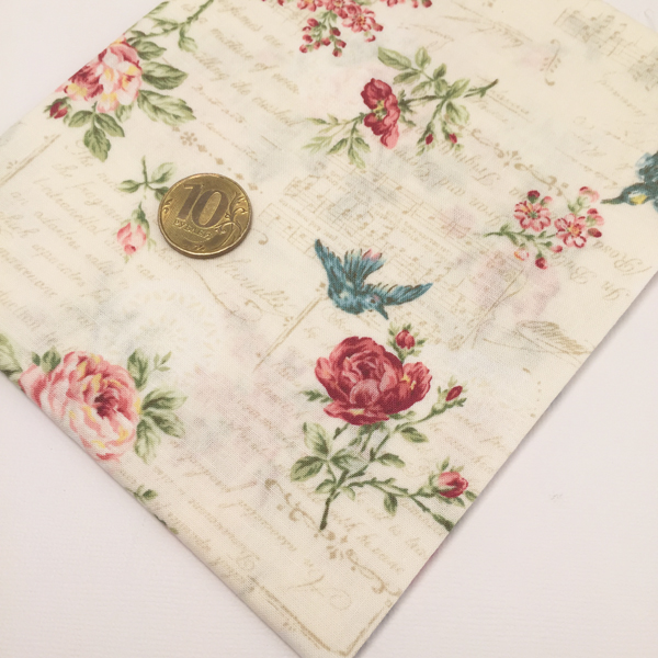 Ткань лоскутная 50 х 55 см "4522", цветы, птички на кремовом
