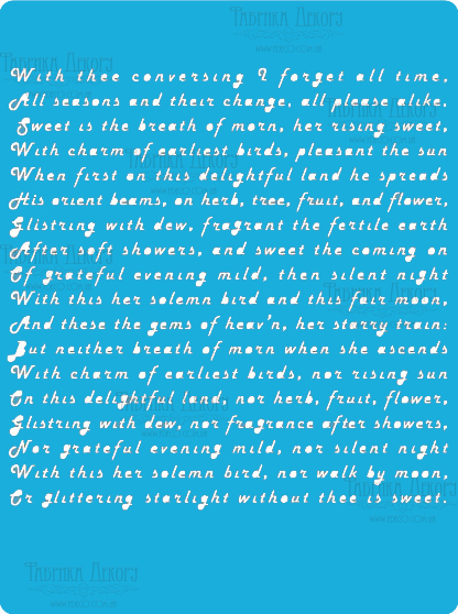 Универсальный трафарет 15смх20см, для многоразового использования. Изготовлен из прозрачного пластика толщиной 190мкм. Подходит для работы с красками, спреями, структурными пастами, шпаклевкой, средствами для матирования стекла на различных поверхностях: дереве, стекле, керамике, бумаге, картоне и других. Может применяться многократно. Для надежной фиксации трафарета на объемных поверхностях рекомендуем использовать специальный клей для трафаретов, не оставляющий следов.