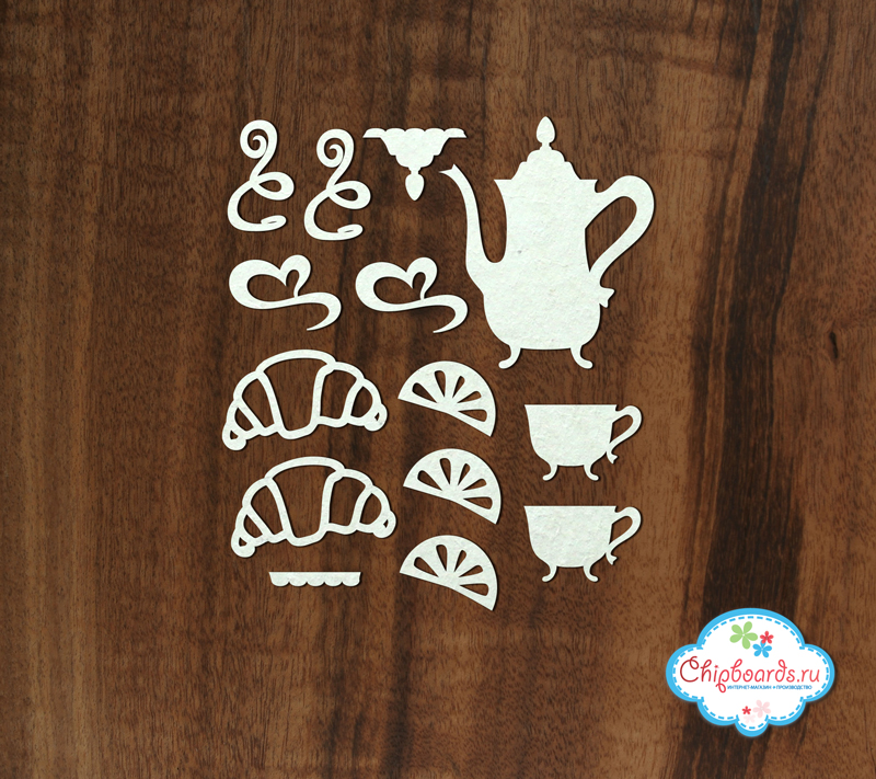 Чайник 4.5 Х 5 см. Чашки - 2.5 Х 1.5 см. Чипборд выполнен из материала толщиной 0.9 - 1.15 мм.
