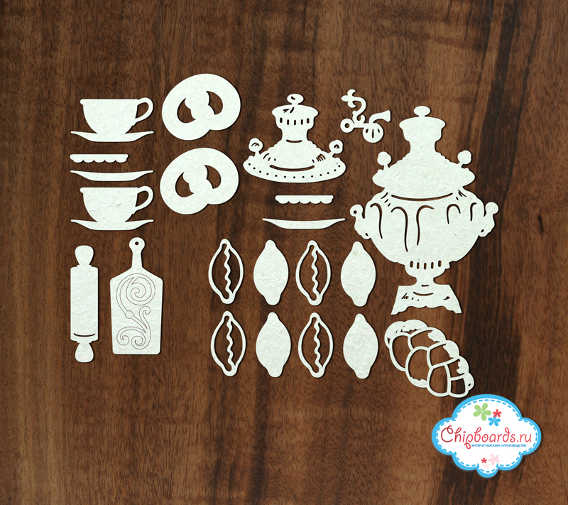 Размер самовара - 5 Х 7.5 см. Выполнен в объеме. Размер кренделей 3 Х 2.5 см. Чипборд выполнен из материала толщиной 0.9 - 1.15 мм.