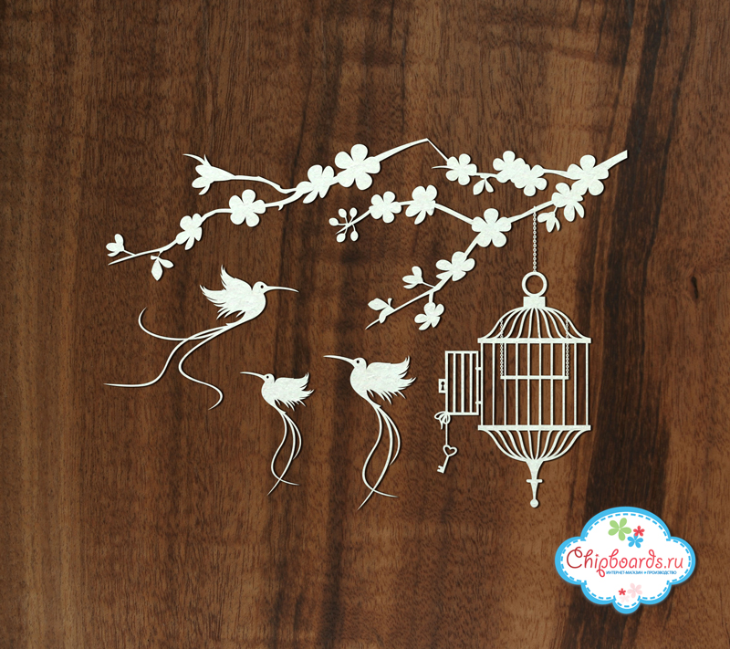 Веточка с клеткой 14 Х 10 см. Птички - 5 Х 4 см. Чипборд выполнен из материала толщиной 0.9 - 1.15 мм.