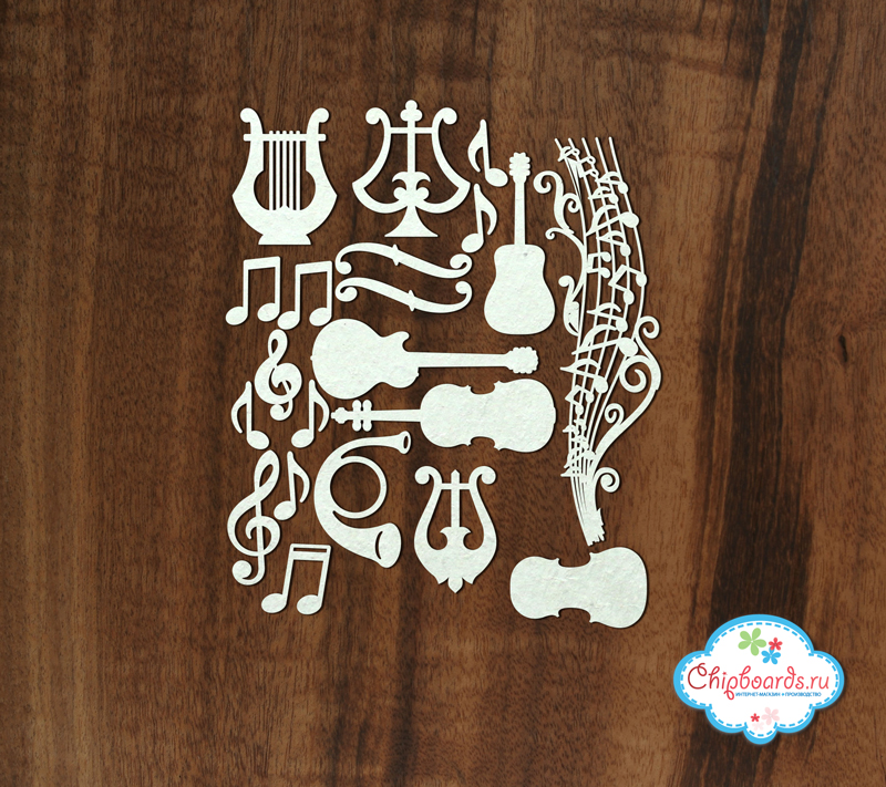 Длина нот - 9 см. Гитара - 2 Х 5 см. Чипборд выполнен из материала толщиной 0.9 - 1.15 мм.
