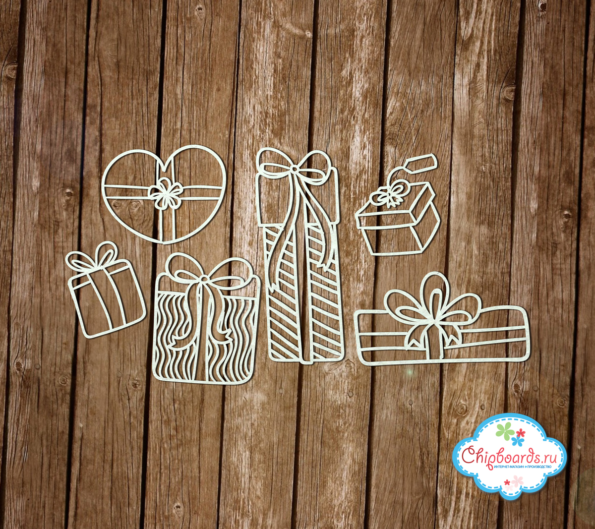Размеры подарков от 2.5 Х 3 см. до 3 Х 7 см. Чипборд выполнен из материала толщиной 0.9 - 1.15 мм.