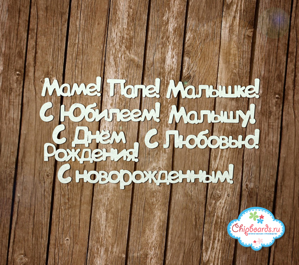 Длины фраз от 4 до 13 см. Высота - 1 см. Чипборд выполнен из материала толщиной 0.9 мм.