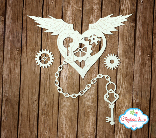 Ширина сердечка с крыльями - 11 см. Полная высота с ключиком - 12 см. Чипборд выполнен из материала 0.9 - 1.15 см.
