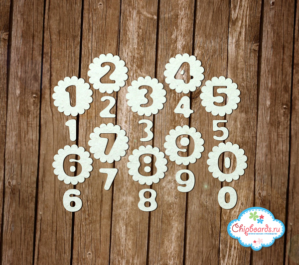 Высота кружков - 3 см. Высота цифр - 1,7 cм. Чипборд выполнен из материала толщиной 0.9 - 1.15 мм.
