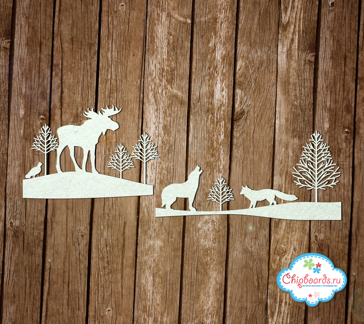 Размер с лосем - 6 X 4 см. Лиса - 8 X 4 см.Чипборд выполнен из материала толщиной 0.9 - 1.15 мм.