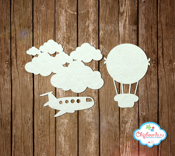 Размер композиции из облачков 8,5х5см. Самолётик - 6х3см. Воздушный шар 7х5см. Чипборд выполнен из материала толщиной 0.9 - 1.15 мм