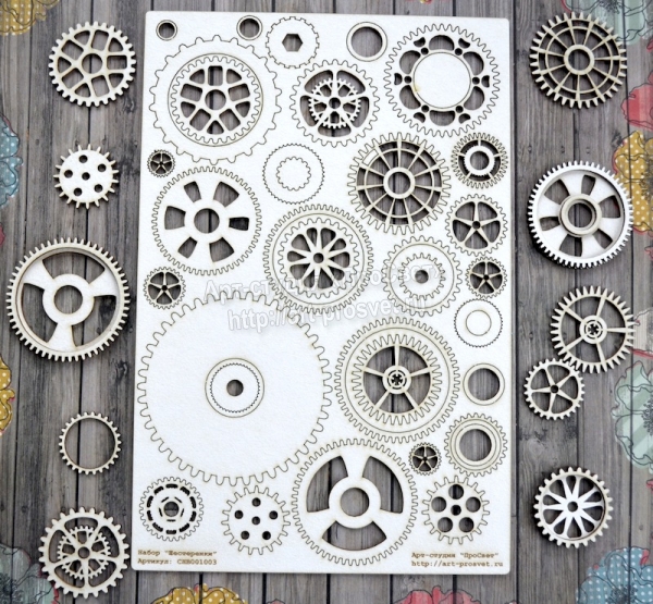 Чипборд выполнен из пивного картона белого цвета толщиной 1,15 мм. Набор шестеренок из 35 элементов 14х21 см. Размер наименьшего элемента: 10х10 мм.Размер наибольшего элемента: 70х70 мм