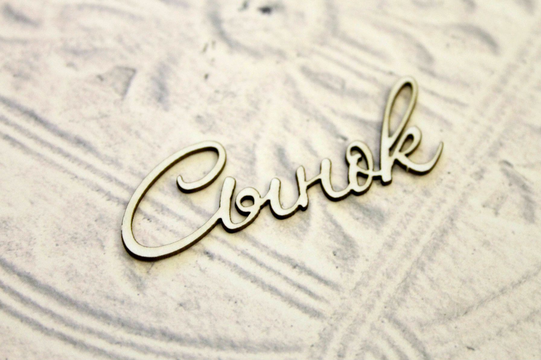 Чипборд из картона толщиной 1.5 мм. Вырезан методом лазерной резки, поэтому возможны характерные следы. Клеится с помощью клея или горячего пистолета. Длина слова около 6,5см. Высота заглавной буквы около 2см, Высота прописных букв около 1,2см