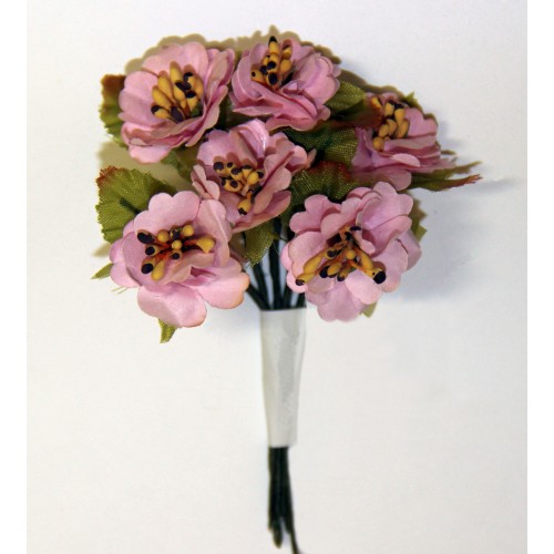 Букетик бумажных цветов с бежевыми тычинками и тканевыми листочками. На ножке. Размер бутона около 2см. В букете 6 бутонов.