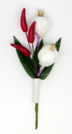 Букетик из чесночка и перчика. 3 перчика, 2 чесночка, 3 листочка. Размер чесночка около 2 см, перчика - 1,5см. Материал бумага, пластик, ткань.