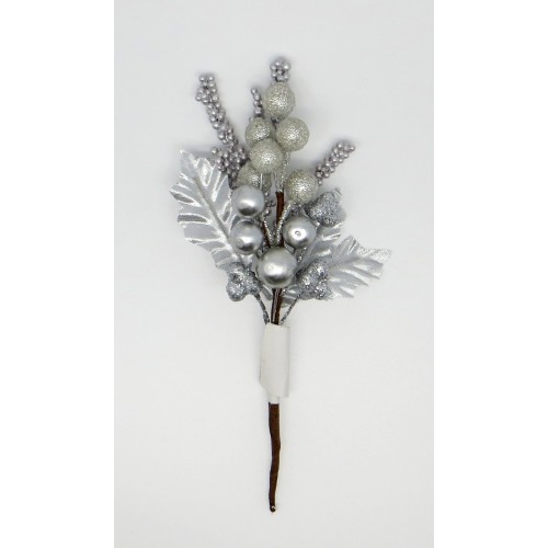 Декоративный букетик из различных ягод и листочков серебряного цвета. Ягоды перламутровые, в обсыпке, в глиттере, два листочка из ткани. Размер ягод от 2мм до 1,5см.