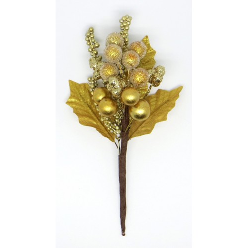 Декоративный букетик из различных ягод и листочков золотого цвета. Ягоды перламутровые, в обсыпке, в глиттере, два листочка из ткани. Размер ягод от 2мм до 1,5см.