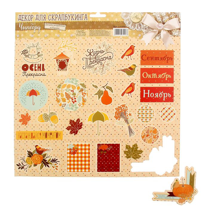 Набор картонных декоративных фигурок на листе 29,5 х 29,5 см. Элементы вырублены. Вырезать не нужно. Достаточно просто выдавить их из общего листа руками, немного нажав.Удобны в использовании. Предназначены для декора любых скрапработ.
