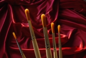 Синтетическая кисть для нанесения красок с деревянной ручкой.