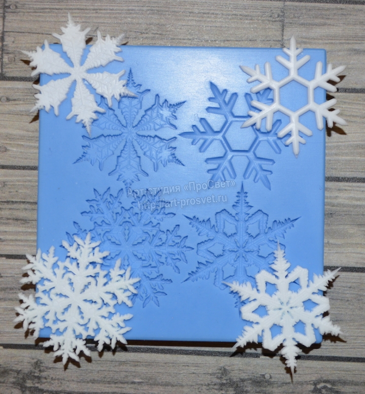Молды (формочки) силиконовые. Используются с глиной, жидким пластиком и тд для получения объёмных декоративных фигурок.Размер каждой снежинки 35х35 мм