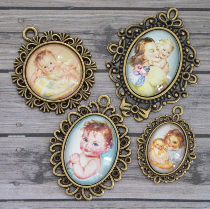абор металлических подвесок со стеклянными кабошонами высокого рельефа. В наборе 2 овальных рамки с размером изображения 18х26мм, 1 круглая, с диаметром 20мм и 1 овальная рамочка с изображением 14х19