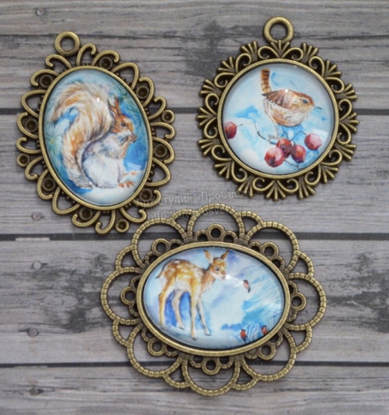 Набор металлических подвесок со стеклянными кабошонами высокого рельефа. В наборе 2 овальные рамки с размером изображения 18х26мм и 1 круглая, с диаметром 20мм