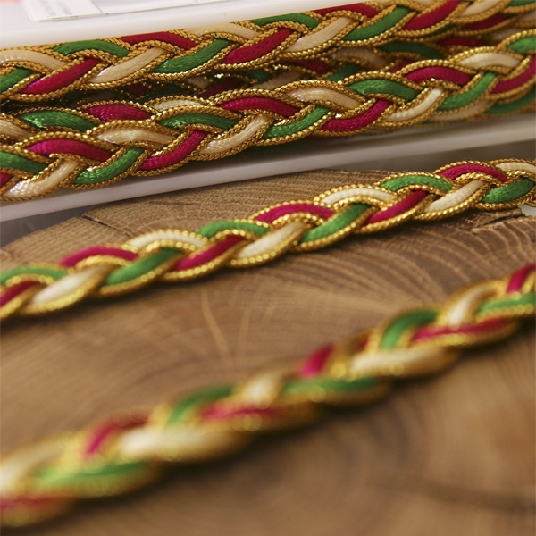 Тесьма "Косичка" 10 мм, цвет зелёный, малиновый, с золотом