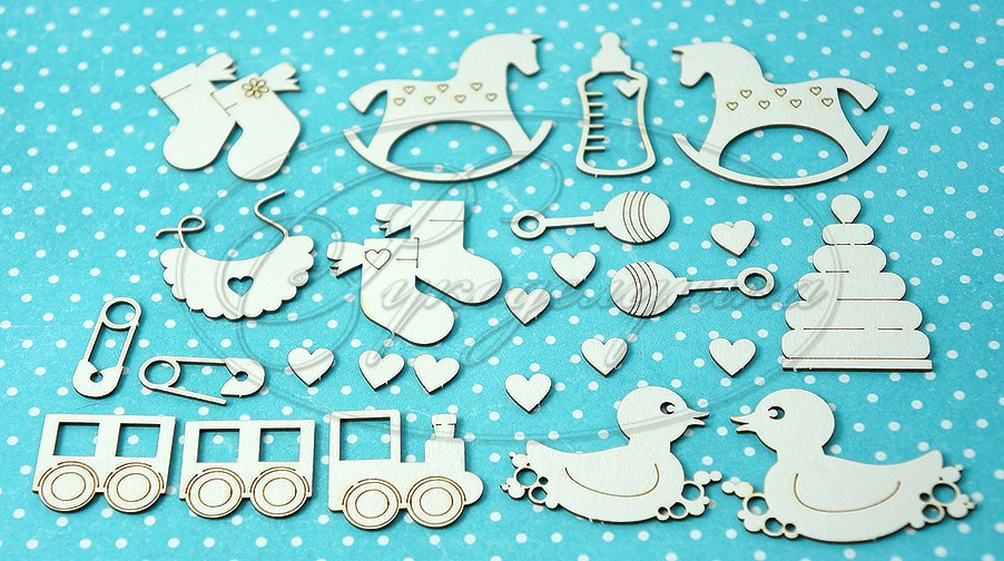 самый маленький элемент (сердечко) 0,8 см, самый крупный (лошадка) 4*3,5 см, длина паровозика с вагончиками 7 см. Используется в качестве украшения для скрапбукинга . Применяется в любых работах. Возможно окрашивание акрилом, акварелью, спреями или любыми другими красящими составами.