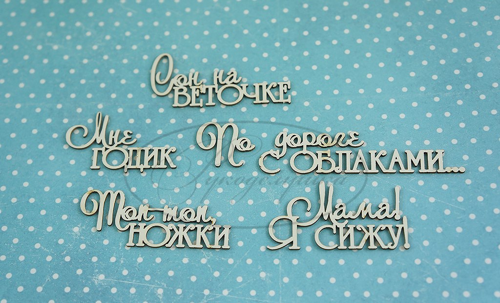 Детские надписи 8, в наборе 5 надписей, длина надписей от 4 до 8,5 см. Используется в качестве украшения для скрапбукинга . Применяется в любых работах. Возможно окрашивание акрилом, акварелью, спреями или любыми другими красящими составами.