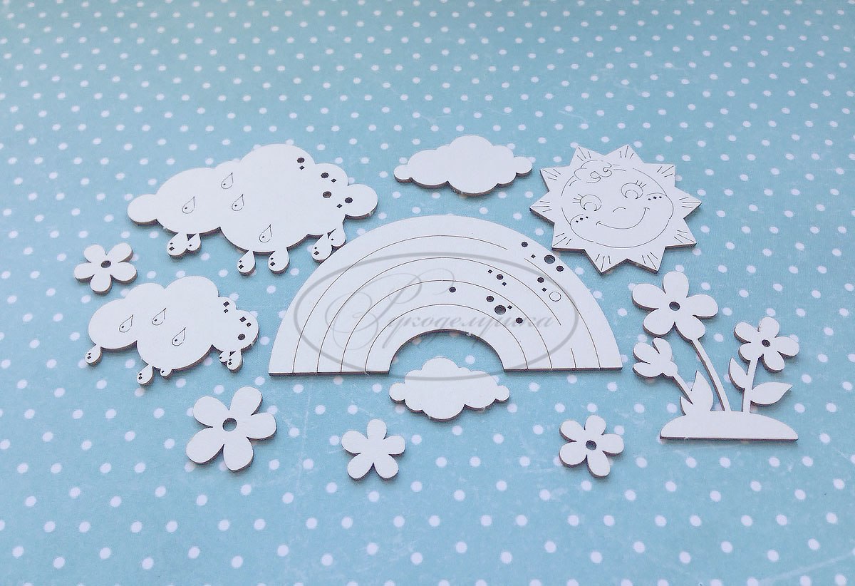 размеры радуги 6,5*3,5см, солнышка 3,5 см, полянки с цветами 3*3,5 см, тучки длиной от 2 до 5,3 см, отдельные цветочки от 1 до 1,5 см. Возможно окрашивание акрилом, акварелью, спреями или любыми другими красящими составами.
