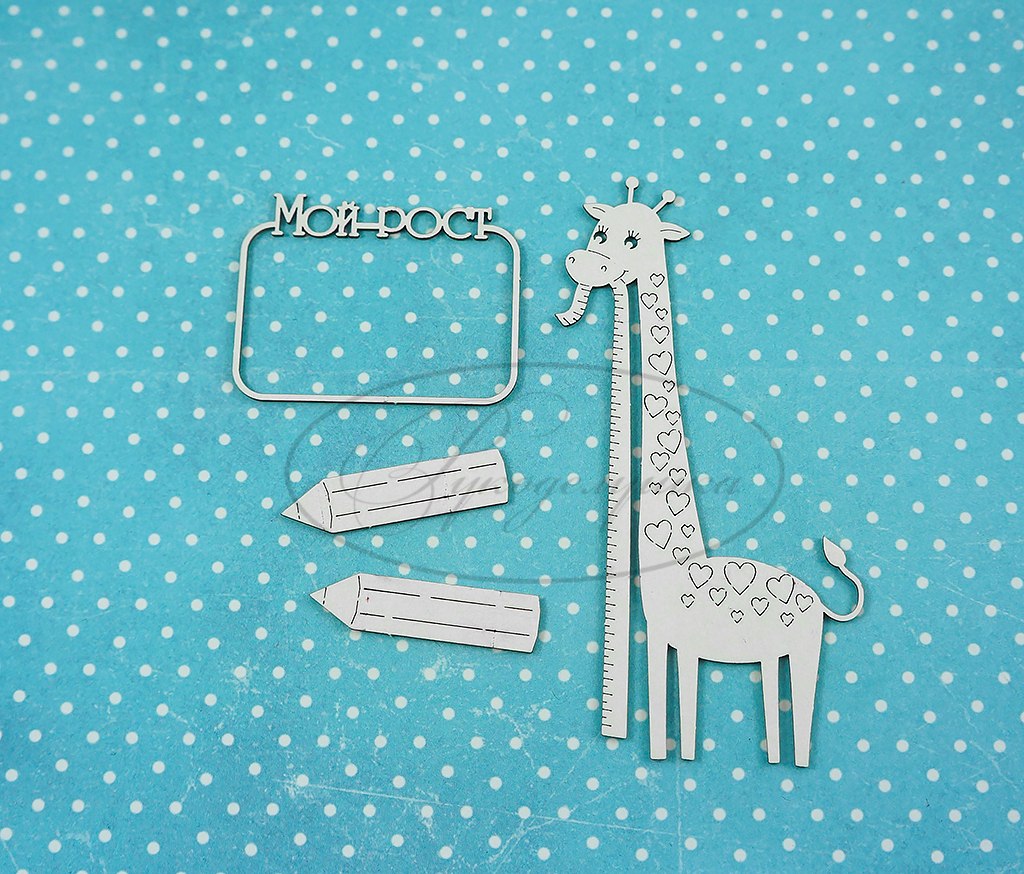 размеры жирафика 5*9,5 см, рамки 4,5*3,5см, одного карандашика 3,5*1 см. Используется в качестве украшения для скрапбукинга . Применяется в любых работах. Возможно окрашивание акрилом, акварелью, спреями или любыми другими красящими составами.