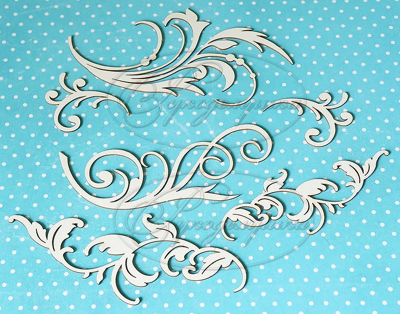 6 элементов,длина элементов от 4 до 10 см. Используется в качестве украшения для скрапбукинга . Применяется в любых работах. Возможно окрашивание акрилом, акварелью, спреями или любыми другими красящими составами.